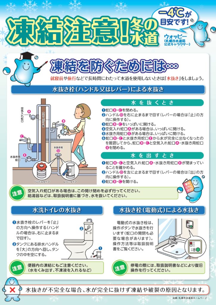 水道管凍結注意!! 2026/01/07 本日釧路の水道凍結指数は90です! 屋外や北向きの日陰にある水道管は凍結リスクが高いので 水抜きや保温などの対策が強く推奨されます。 皆さん冷え込み激しく凍結に警戒しましょう。